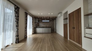 床には無垢材を使い、キッチンには造作でカウンターや棚、